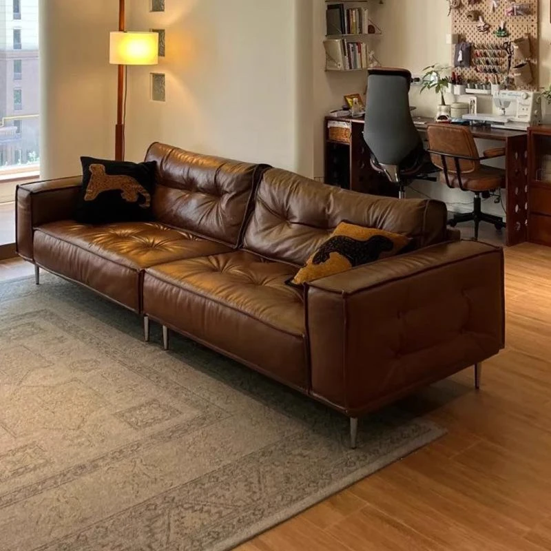 フレンチヴィンテージ豆腐ブロックオイルワックス本革ソファー、中古小型リビングに最適!2024年新作、背もたれがストレートで高脚デザイン、スタイリッシュな空間を演出します。