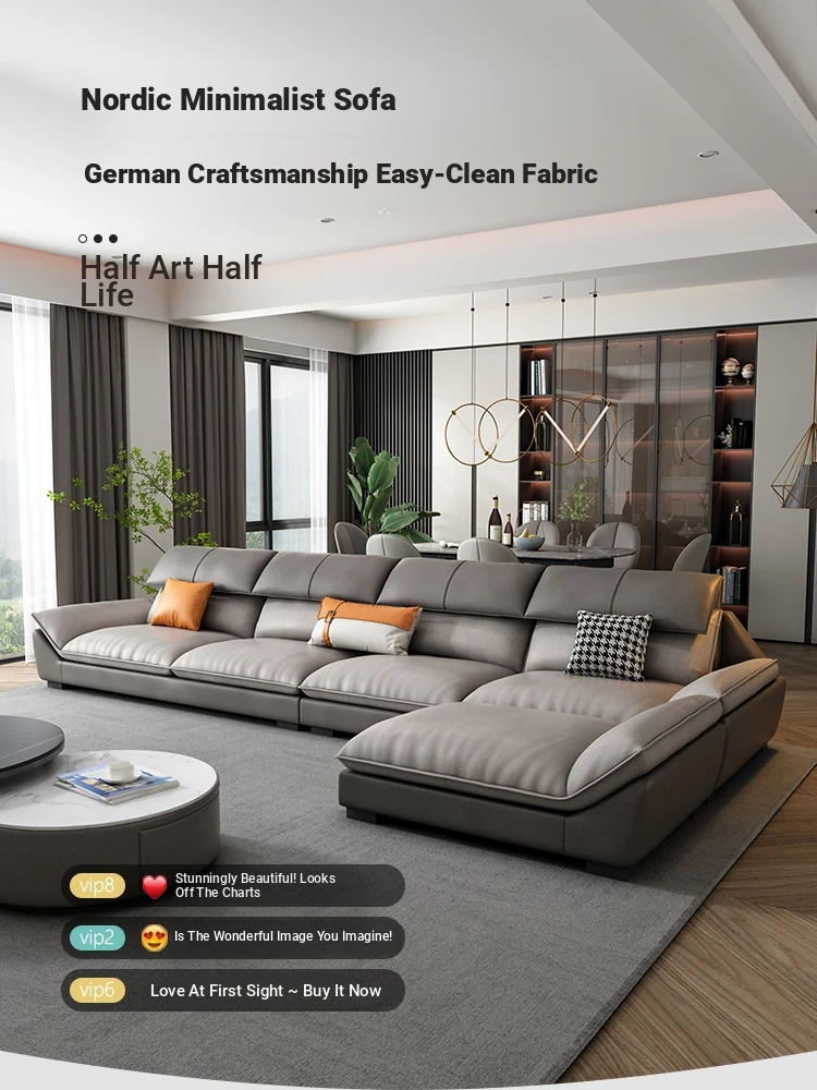 Nordic Style Tech Fabric Sofa for Living Room - Modern Minimalist Light Luxury, Perfect for Small Spaces, Accommodating 3-4 People with Eco-Friendly Latex and Genuine Leather Upholstery