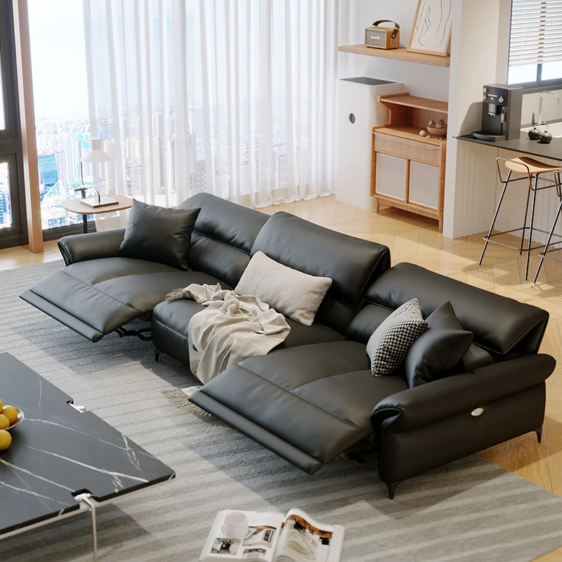 Elegant Modern Electric Sofa - Luxurious Small Space Design for Living Room and Home Theater - Italian Style Black Genuine Leather Three-Seater