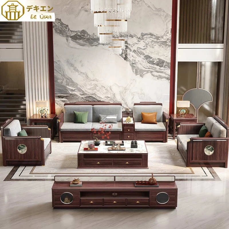 新中式スタイルのウッド調ウッドソファー - フルウッド製のリビングルーム用コンビネーション、コンパクトなスペースにも最適な収納付きカウチソファー!高品質な天然木材で、落ち着いた雰囲気を演出します。