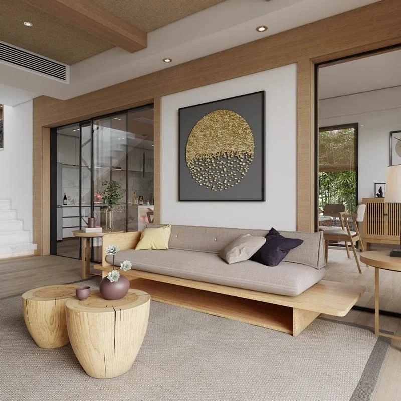 Nordic Minimalist Japanese Sofa Bed - Vintage Solid Wood Sofa with Drawers for Small Spaces, Perfect for Airbnb and Cozy Living Rooms - Three-Seater Design