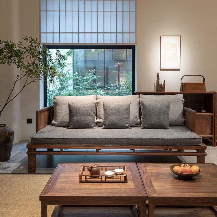 Modern Minimalist Zen Style Solid Wood Sofa Set in Black Walnut - Full Fabric Couch for Living Room, Perfect for Two
