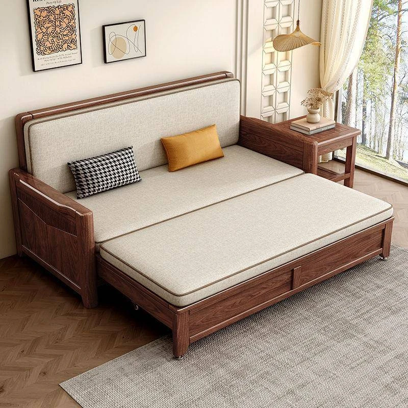 Modern Chinese Style Black Walnut Solid Wood Sofa Bed - Multi-Functional, Expandable, and Foldable Storage Sofa for Living Room, Minimalist Design
