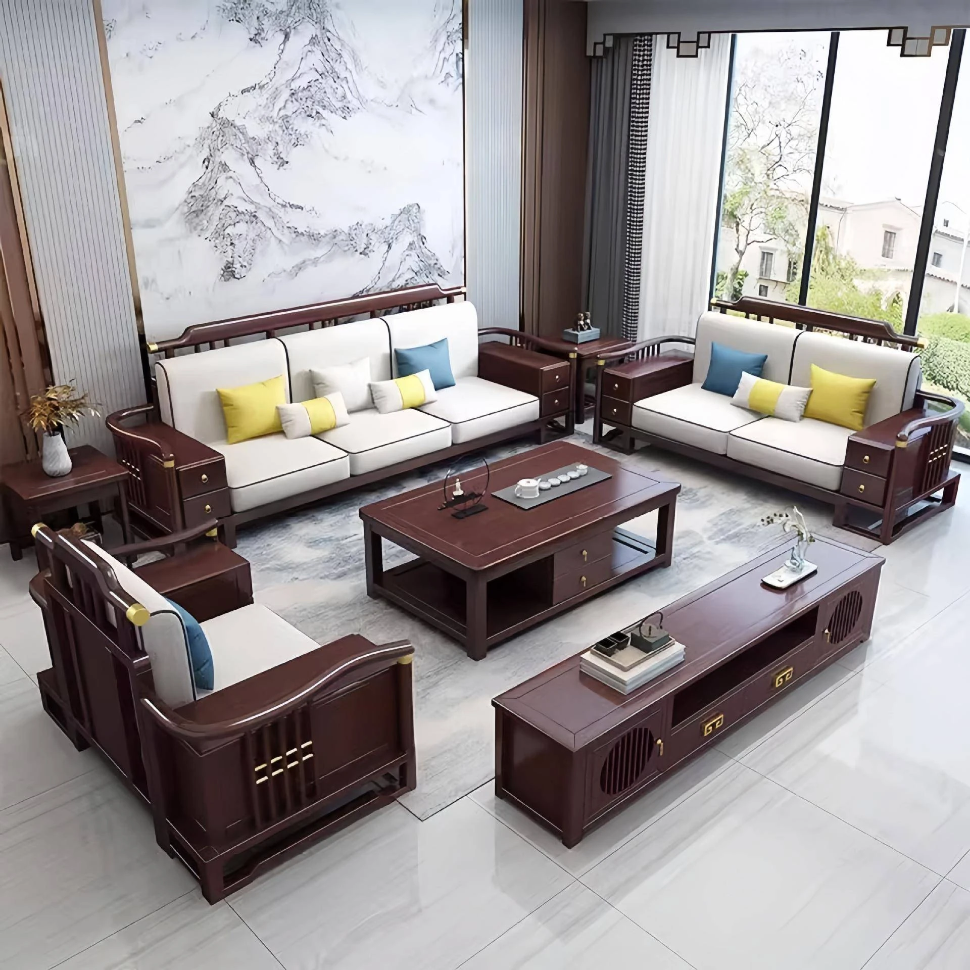 Luxurious Solid Wood New Chinese Style Red Sandalwood Sofa Set - Removable and Washable Fabric, Multi-Person Combination, Direct from Manufacturer