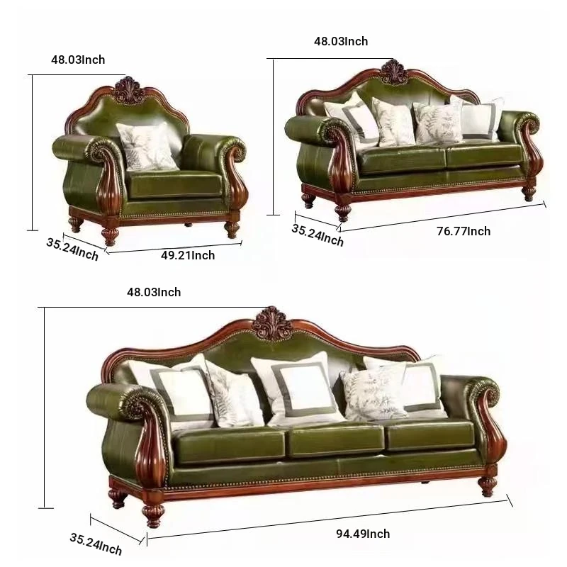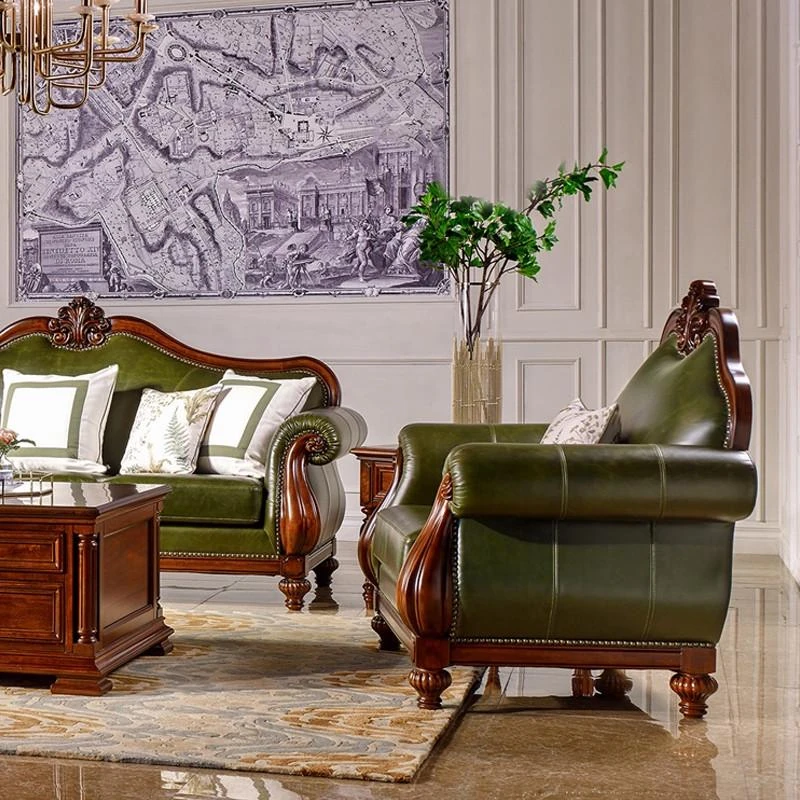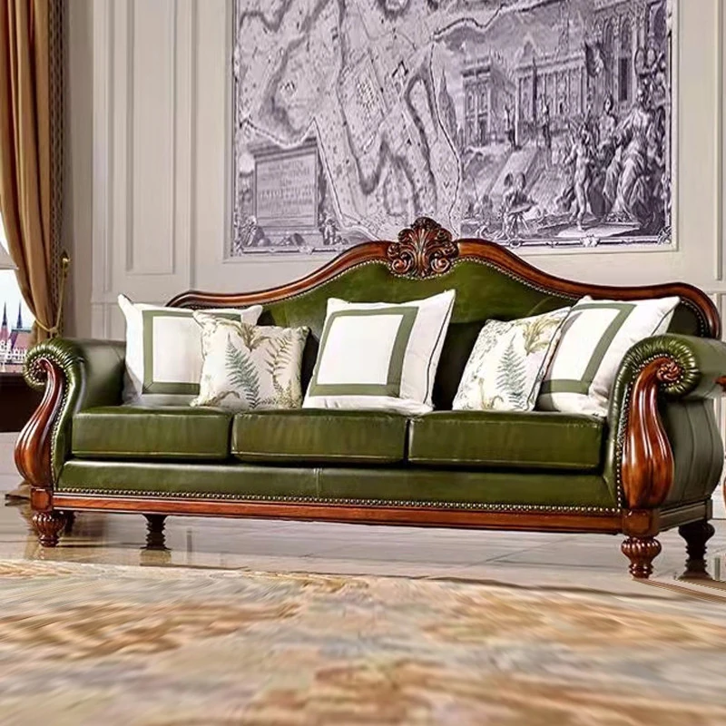 Luxury Vintage American Genuine Leather Sofa Set with Solid Wood Carvings - Elegant European Style Furniture for Spacious Living Rooms