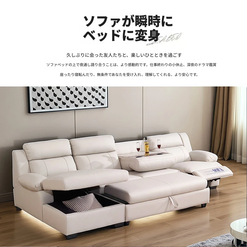 電動多機能ソファ【壁に寄せられる省スペース】小型住宅向け!高級本革製、リクライニング可能、収納付きのデザイン。快適なカプセル型の空間で、貴族のような贅沢を体験!