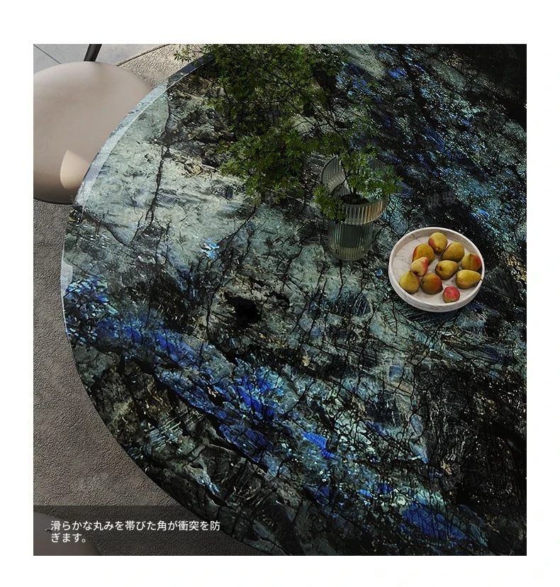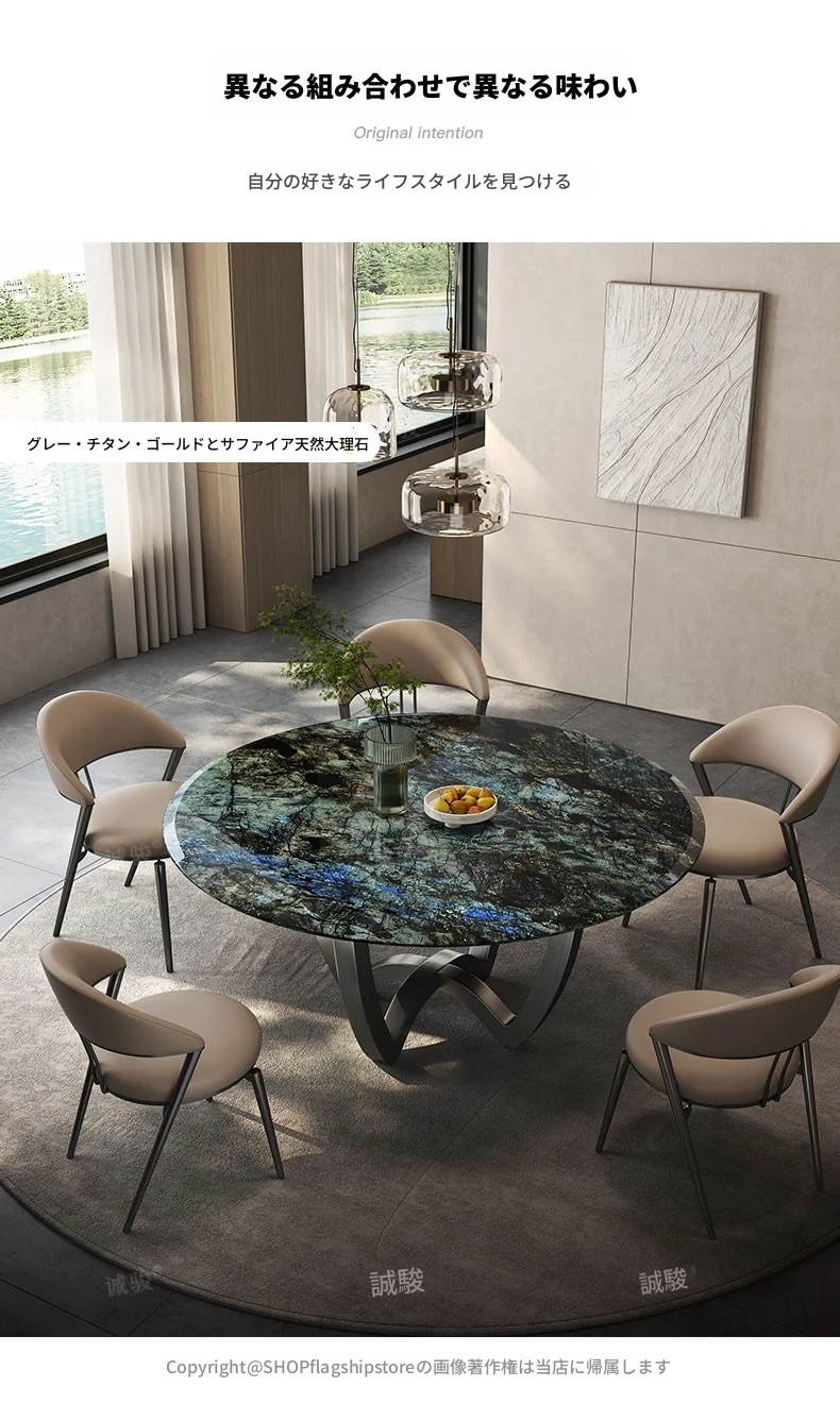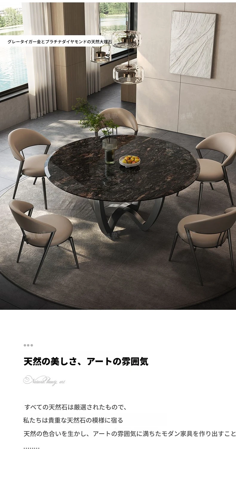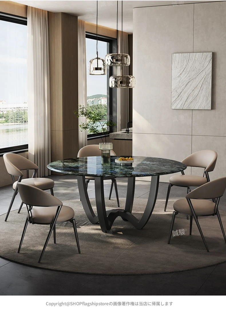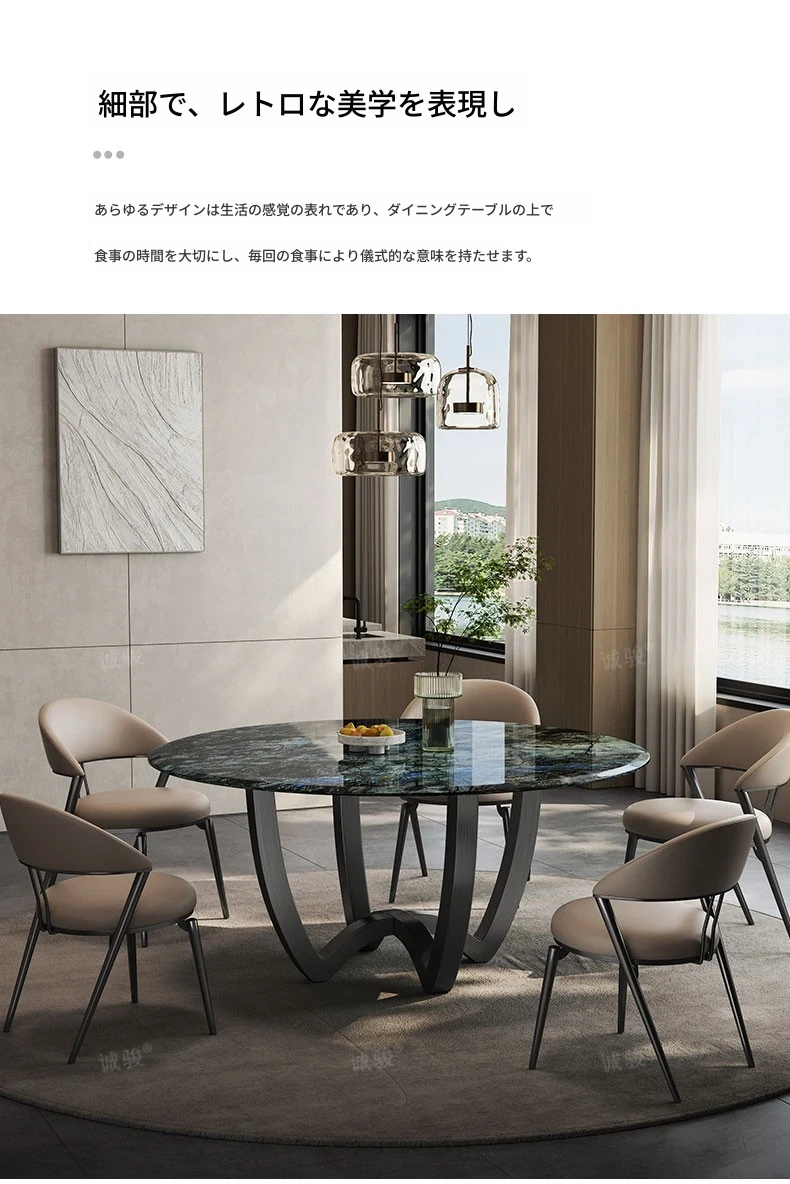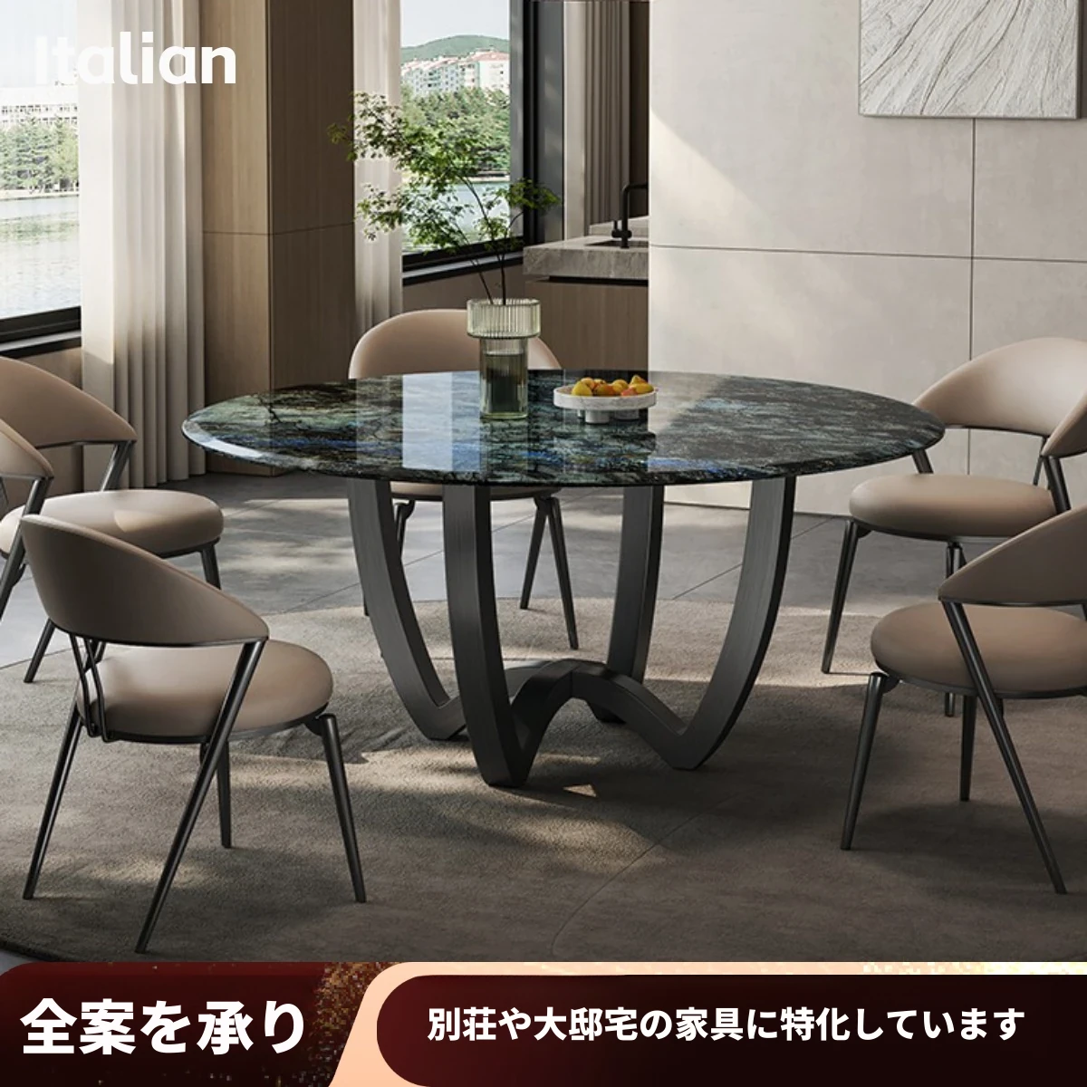 高級感溢れる大理石のラウンドダイニングテーブル - 自然のエメラルドストーンを使用した、6人用の贅沢な家族向けセット。ヴィラにぴったりの洗練されたデザインで、特別なひとときを演出します。