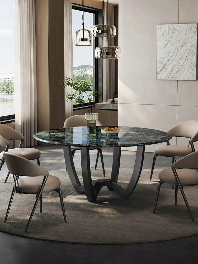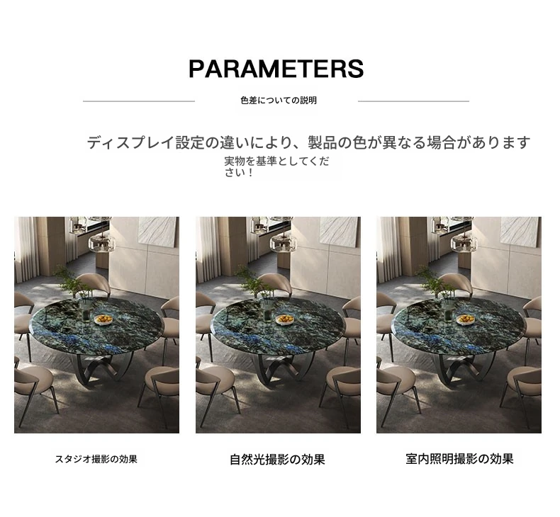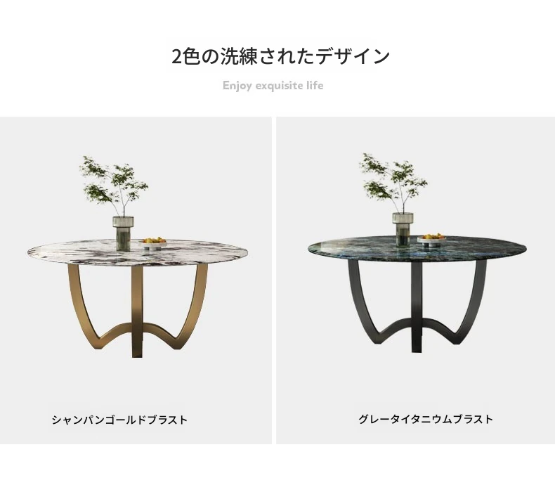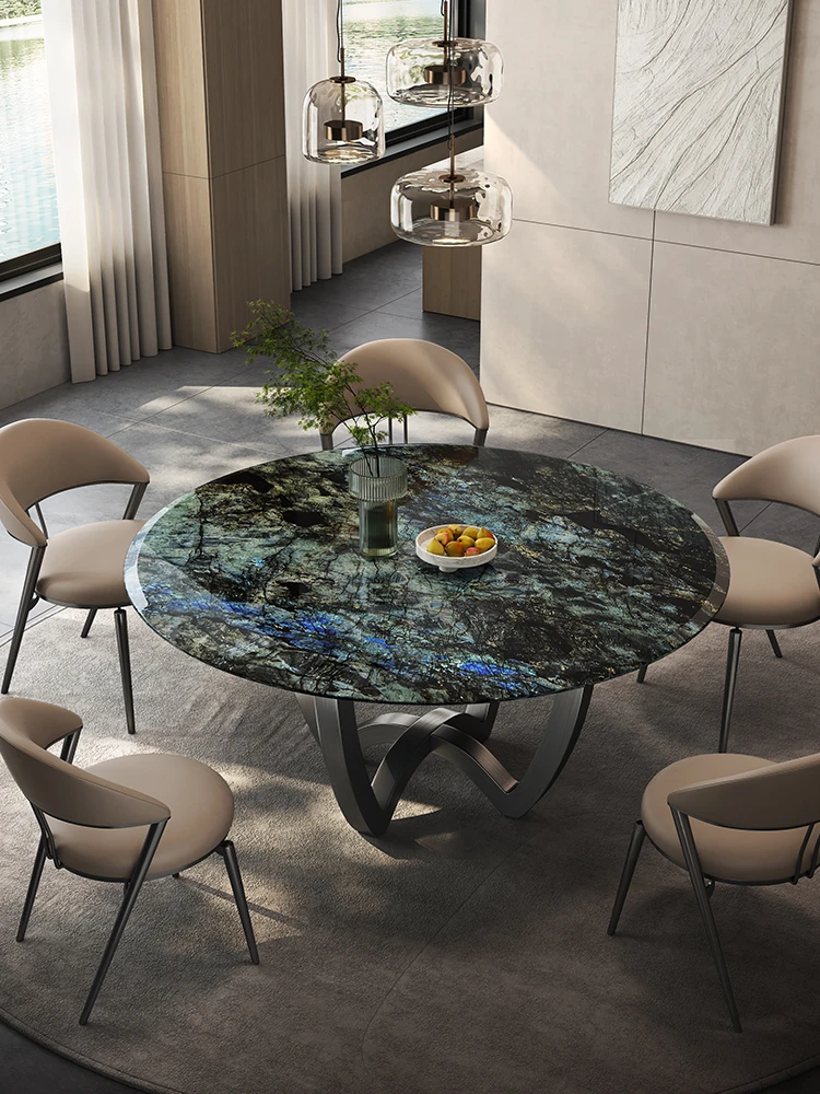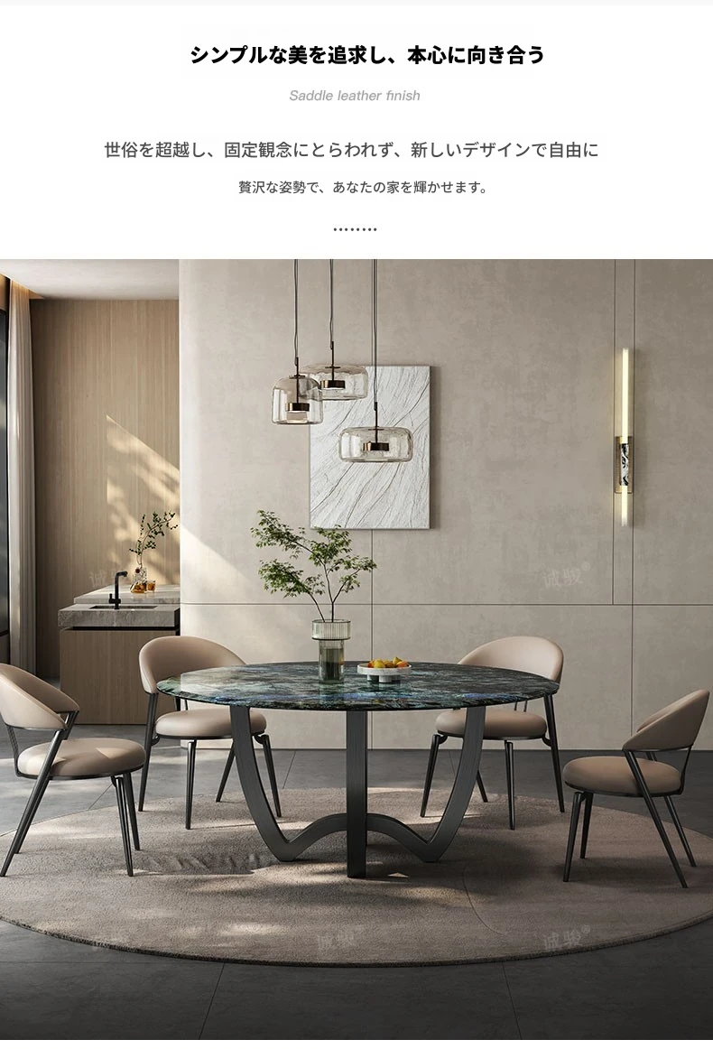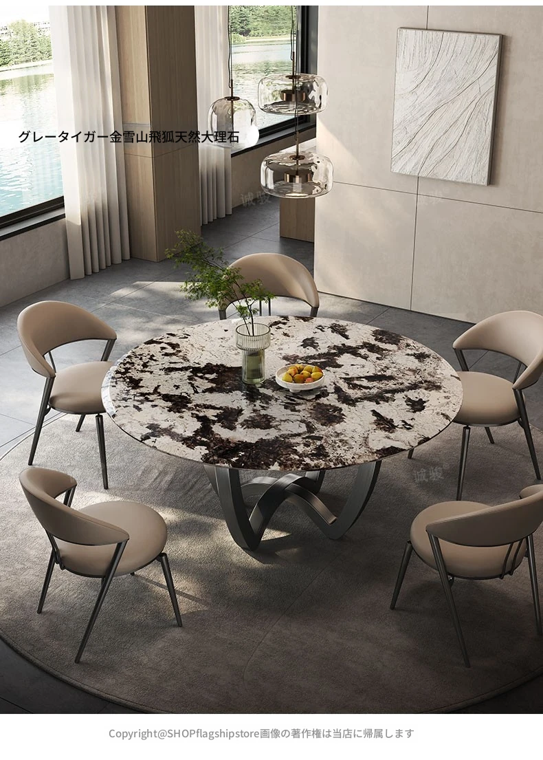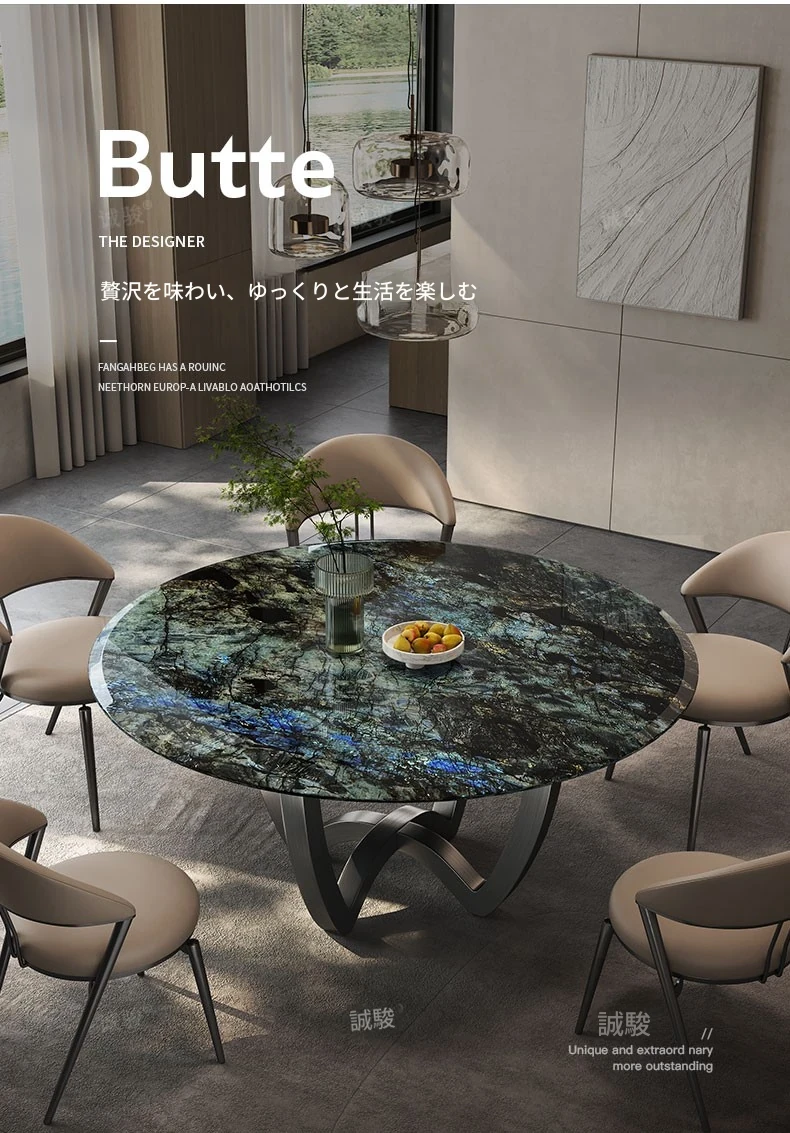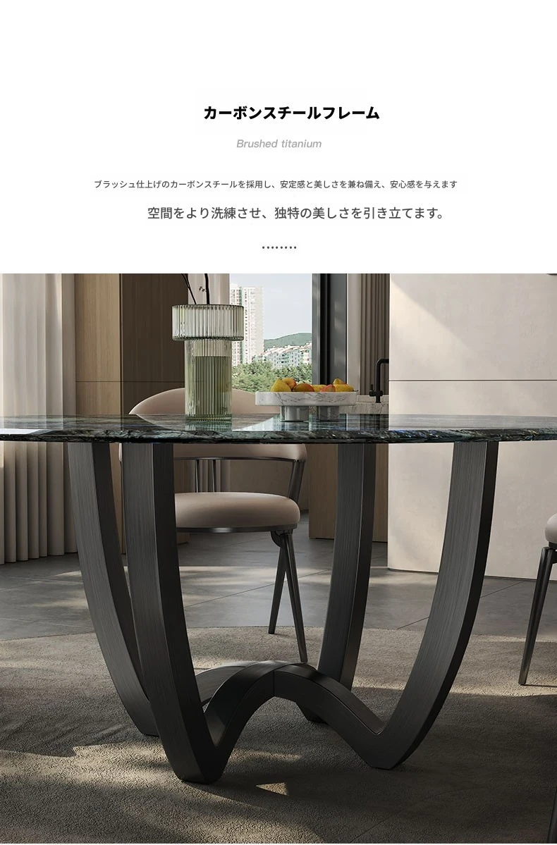 高級感溢れる大理石のラウンドダイニングテーブル - 自然のエメラルドストーンを使用した、6人用の贅沢な家族向けセット。ヴィラにぴったりの洗練されたデザインで、特別なひとときを演出します。