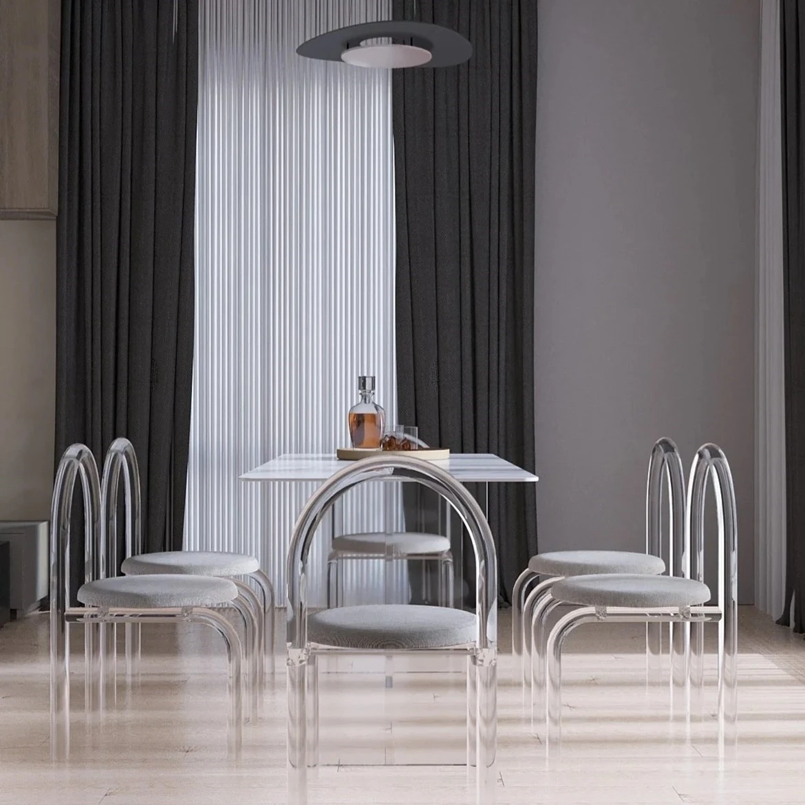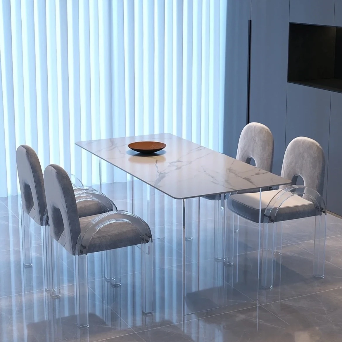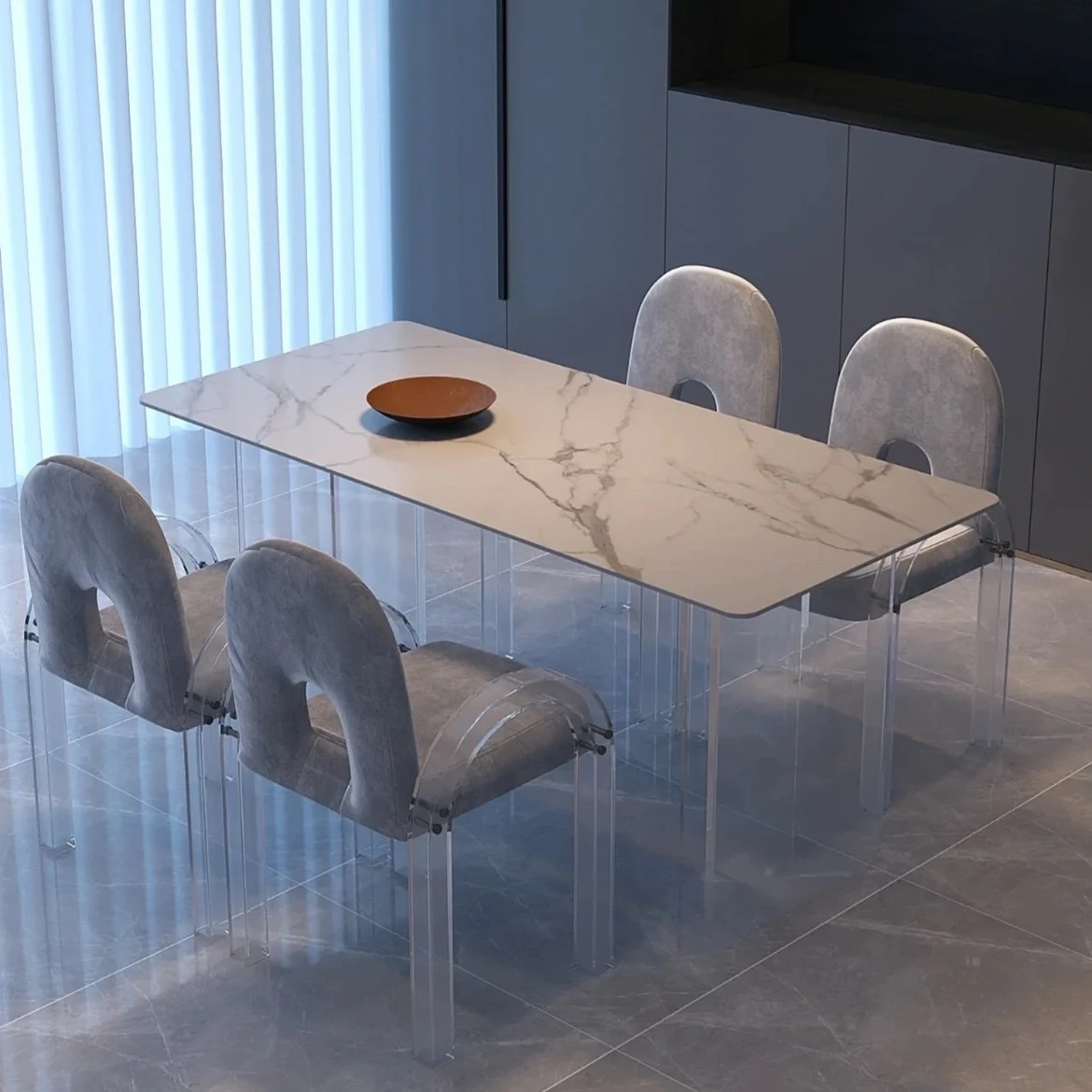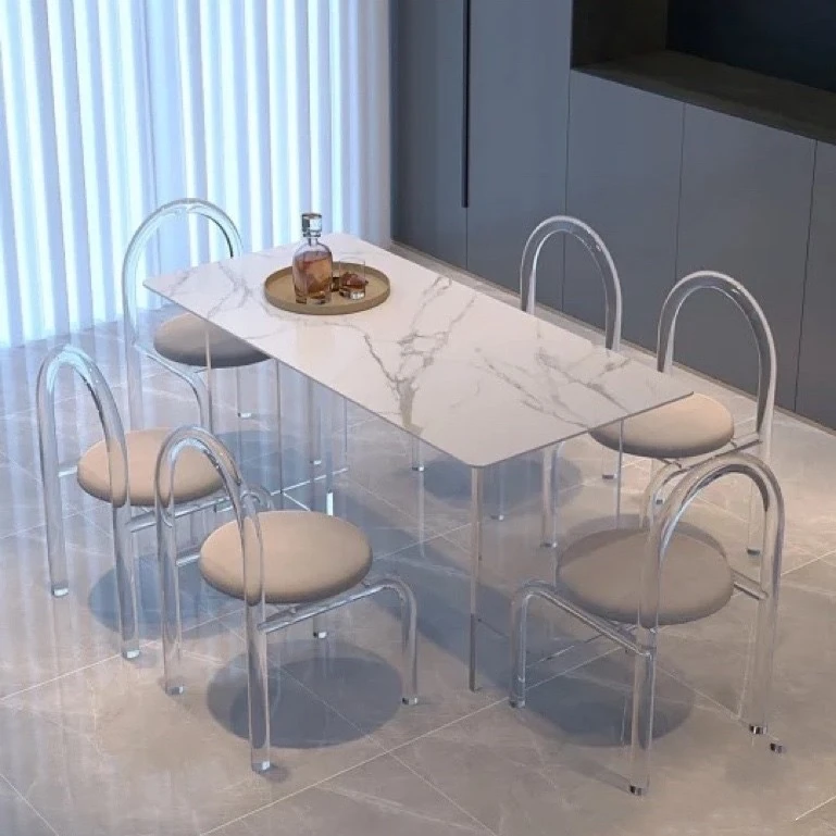 アクリル浮遊岩板ダイニングテーブル - イタリアンシンプルデザインのモダン長方形テーブル、クリームカラーのアイランドスタイルでおしゃれな家庭用食卓。