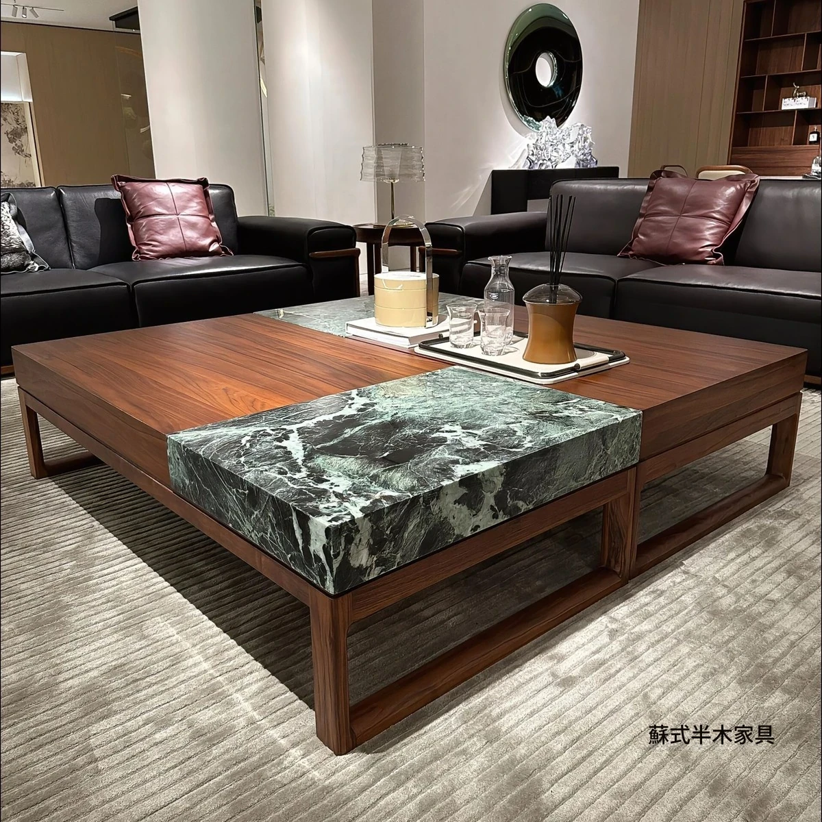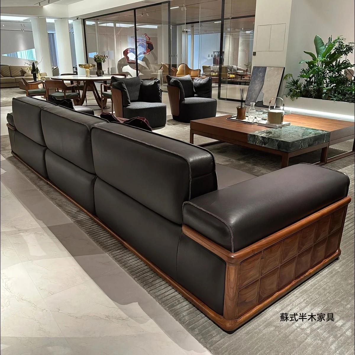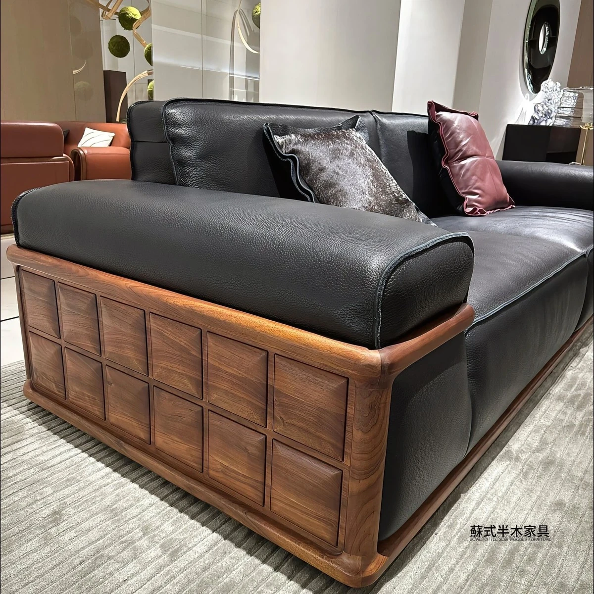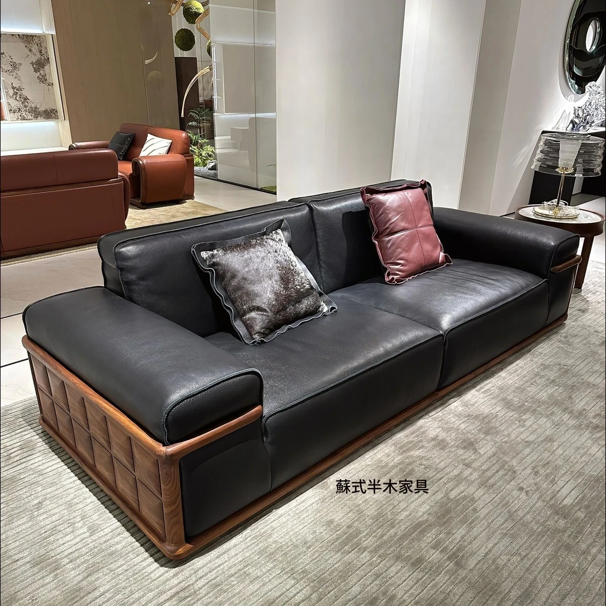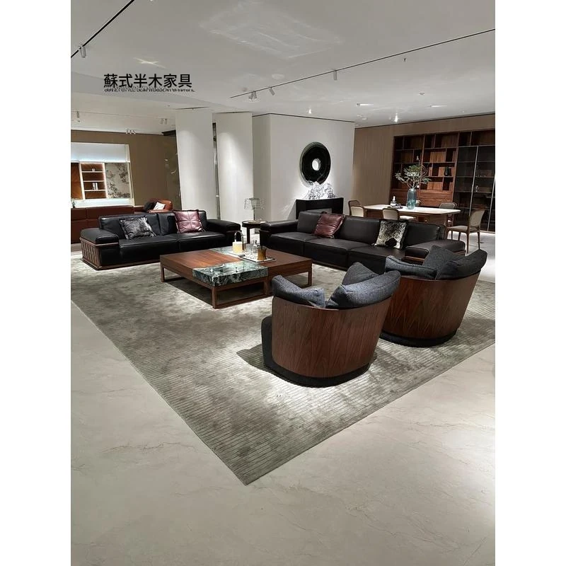 北米産ブラックウォールナットのモダンでシンプルなラグジュアリーソファセット - 高品質な本革使用、別荘やリビングに最適なスタイリッシュなデザイン。