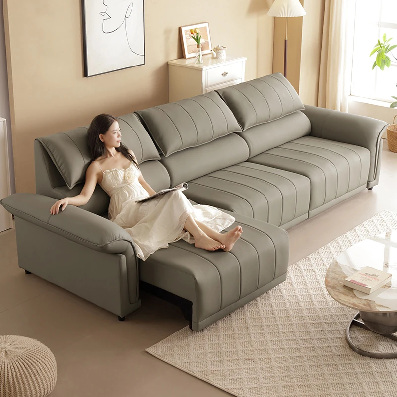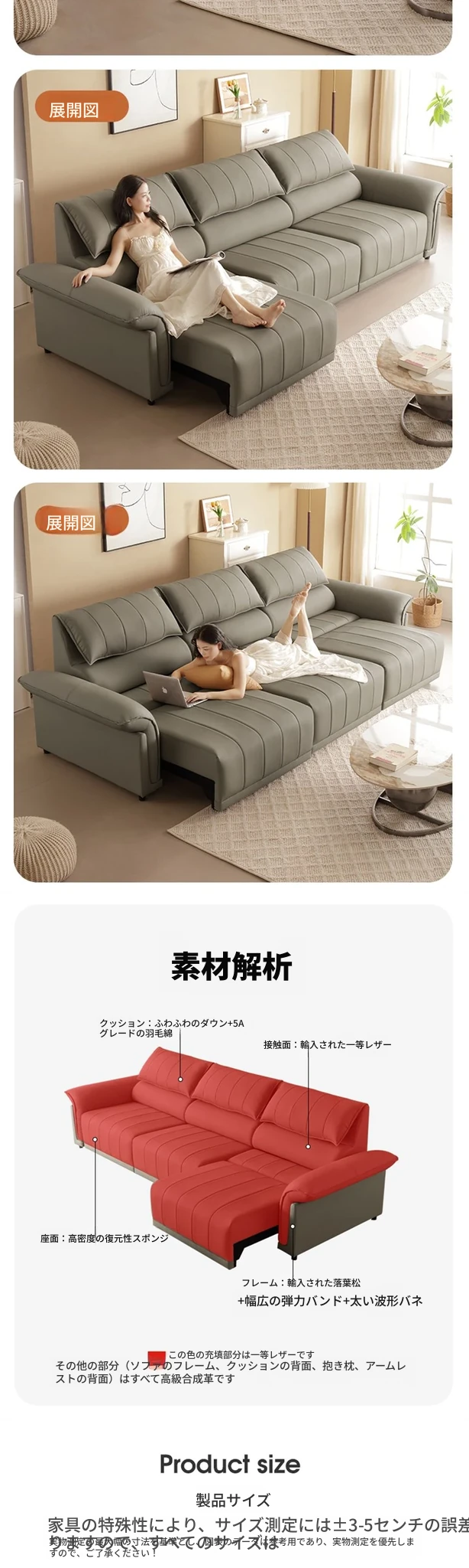 厳選されたイタリアンミニマルデザインの電動多機能レザーソファベッドL型 - 高級牛革使用で、スタイリッシュかつ快適な空間を演出!伸縮可能で、リビングにも最適なアイテムです。