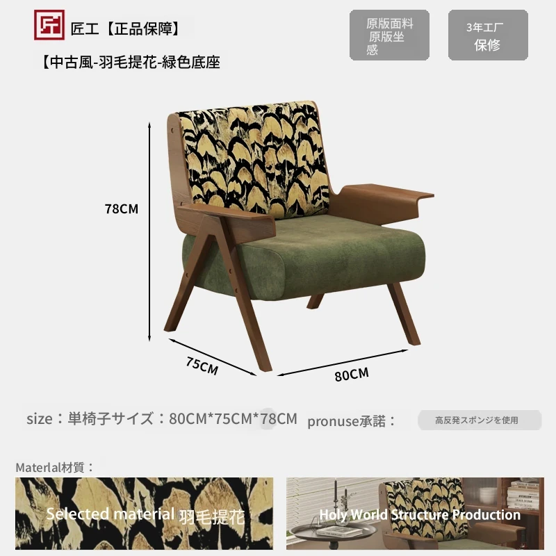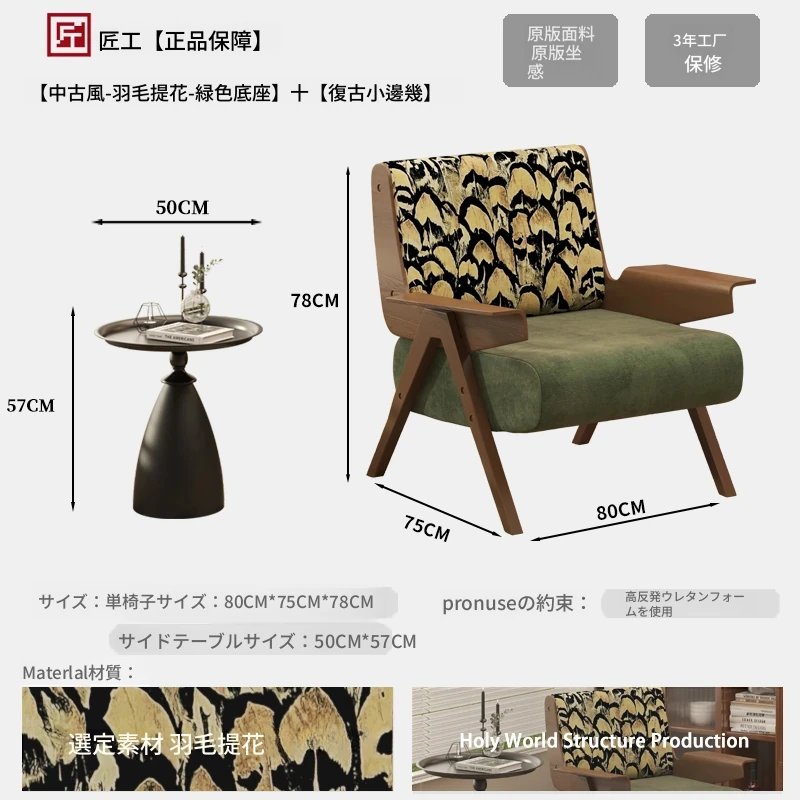 1脚のフェザーグリーンチェア+レトロサイドテーブル【クッション付き】