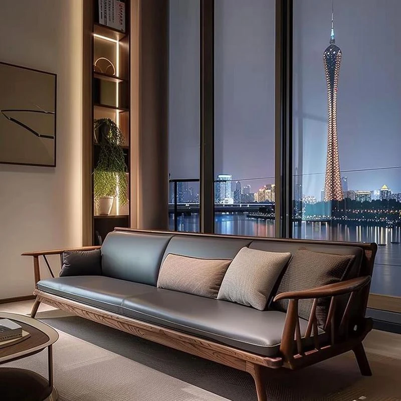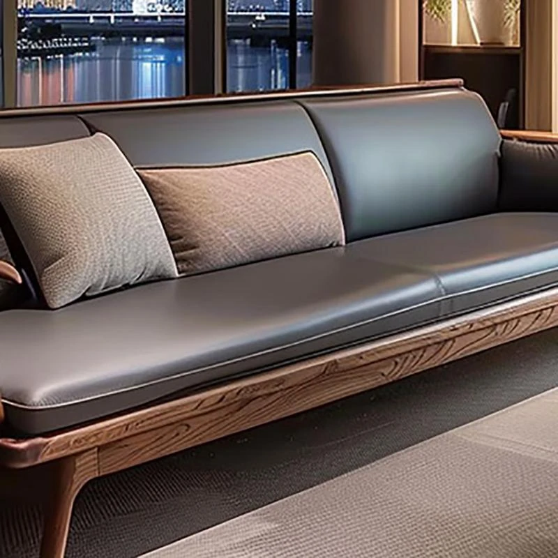 新中式禅スタイル本革ソファー - ブラックウォールナットとホワイトアッシュの軽やかな高級感!オフィス、ホテル、民宿、リビングに最適な無垢材家具。心地よい空間を演出します。